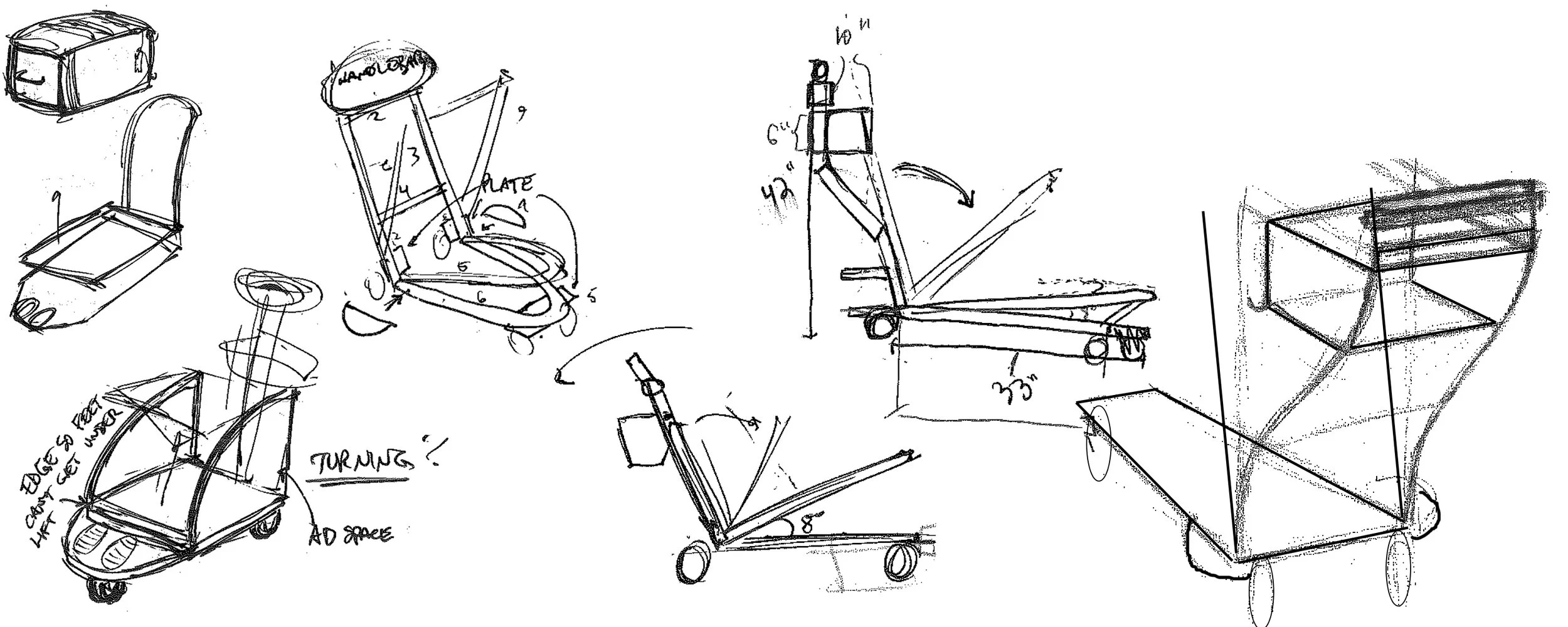 Current airport trolleys are designed to help travelers carry heavy luggage around the airport; however, its awkward steering often causes suitcases to fall off and/or ram into fellow travelers. As a result, this project was a collaboration with Evan Landau to create an ergonomic and convenient trolley that better facilitates the transportation of luggage without any additional stress.